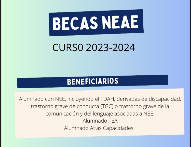Se abre el plazo de solicitud de becas para el alumnado con NEE. El plazo será del 8 de mayo hasta el 20 de septiembre. Las novedades y requisitos para la solicitud los pueden ver en el documento adjunto. Les recordamos que para alumnado con TDAH no ha habido cambios en la convocatoria de beca en relación con anteriores convocatorias.