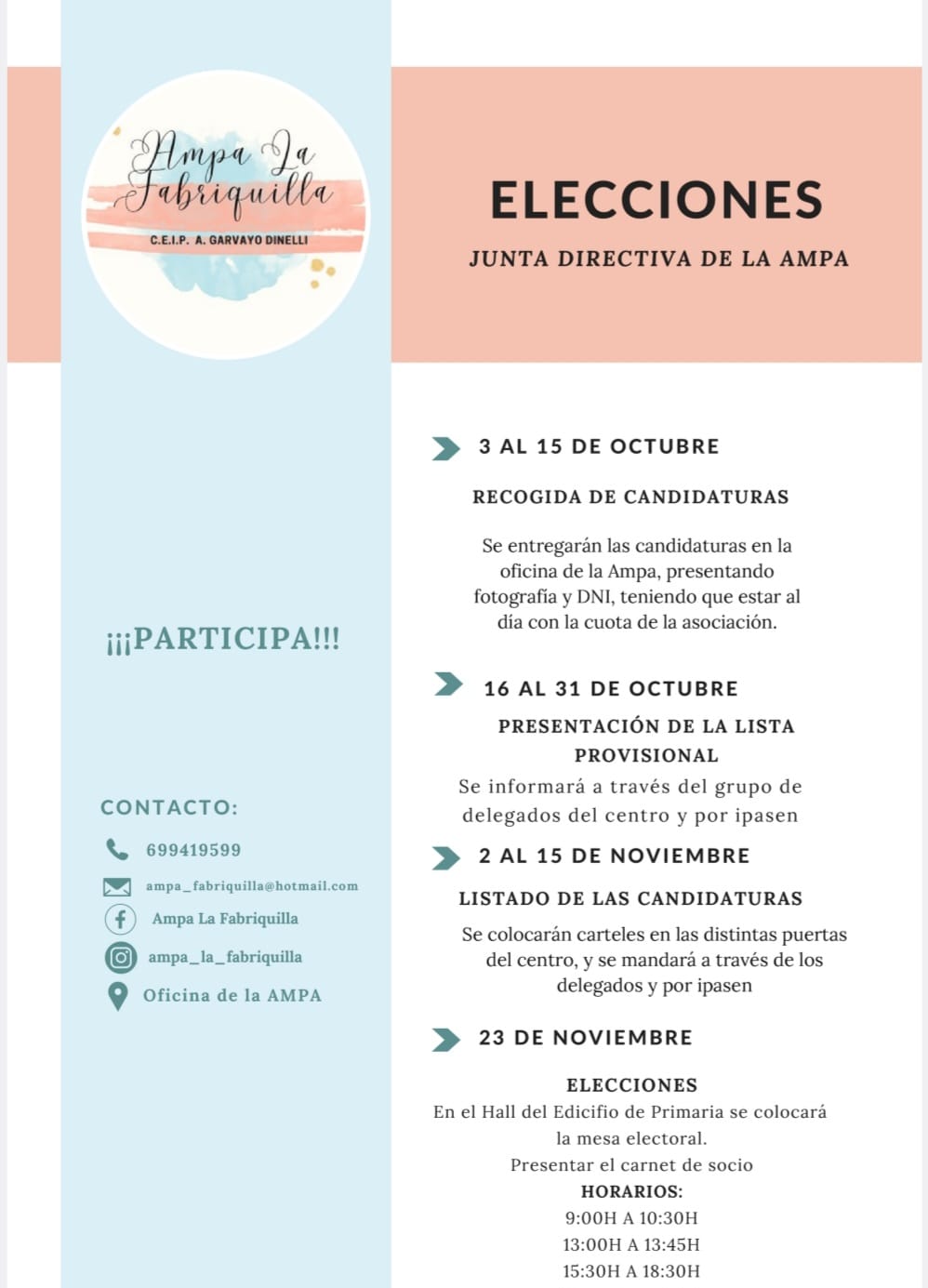 Se informa sobre la convocatoria de próximas elecciones a la junta directiva del AMPA. A continuación se detallan los plazos y fechas. De igual manera se envía el proceso para inscribirse como padres/madres, tutores al AMPA.