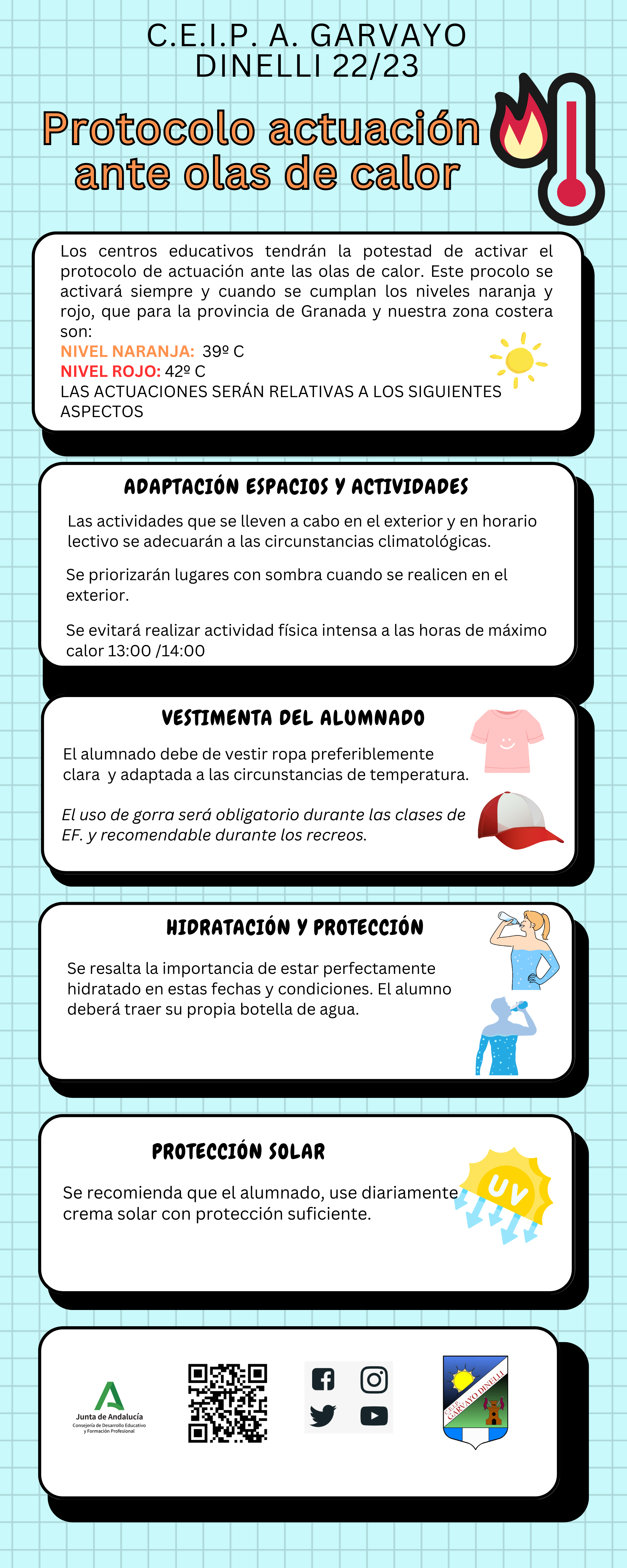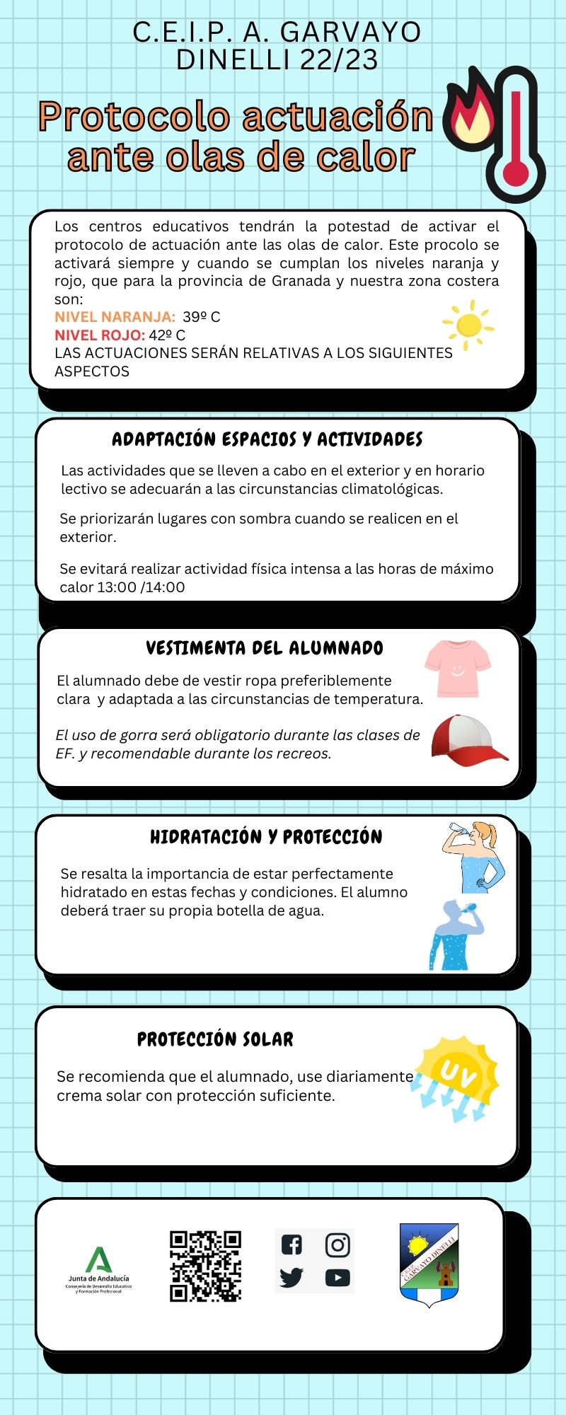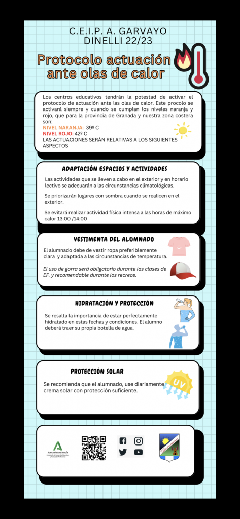 En la infografía se recogen los principales aspectos presentes en el protocolo de actuación elaborado para nuestro colegio ante olas de calor. Abajo pueden consultar y descargar el documento completo, así como la infografía resumen. Recuerden PROTEGERSE e HIDRATARSE.